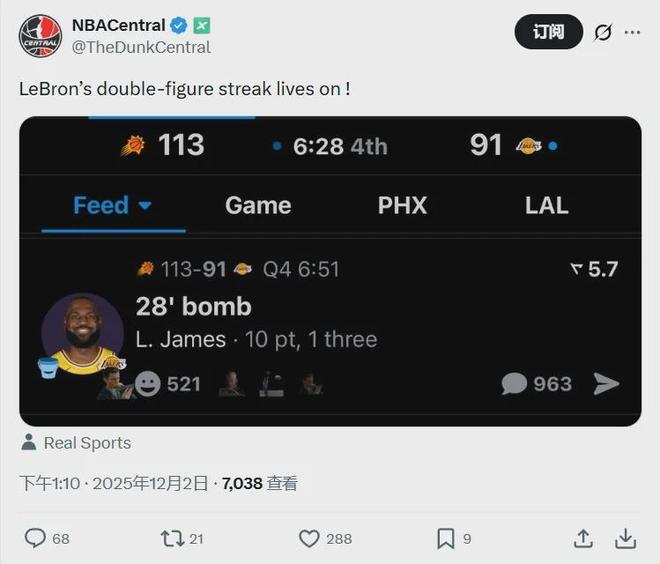 好在单场10分,让这位超巨延续了自己得分上双纪录,已连续1297次得分上双,乃NBA史上最长纪录,上次单场得分未上双还得追溯到2007年。